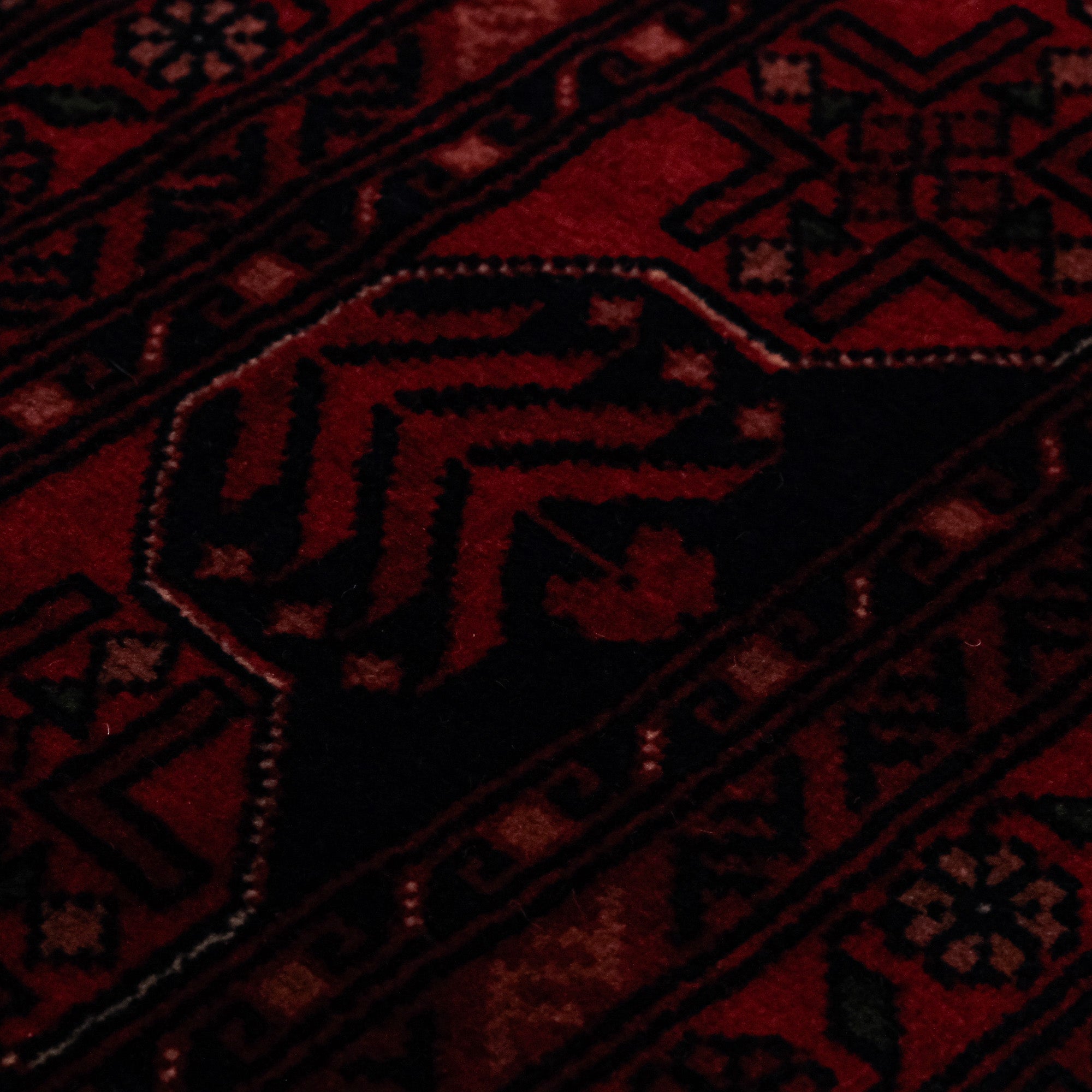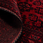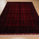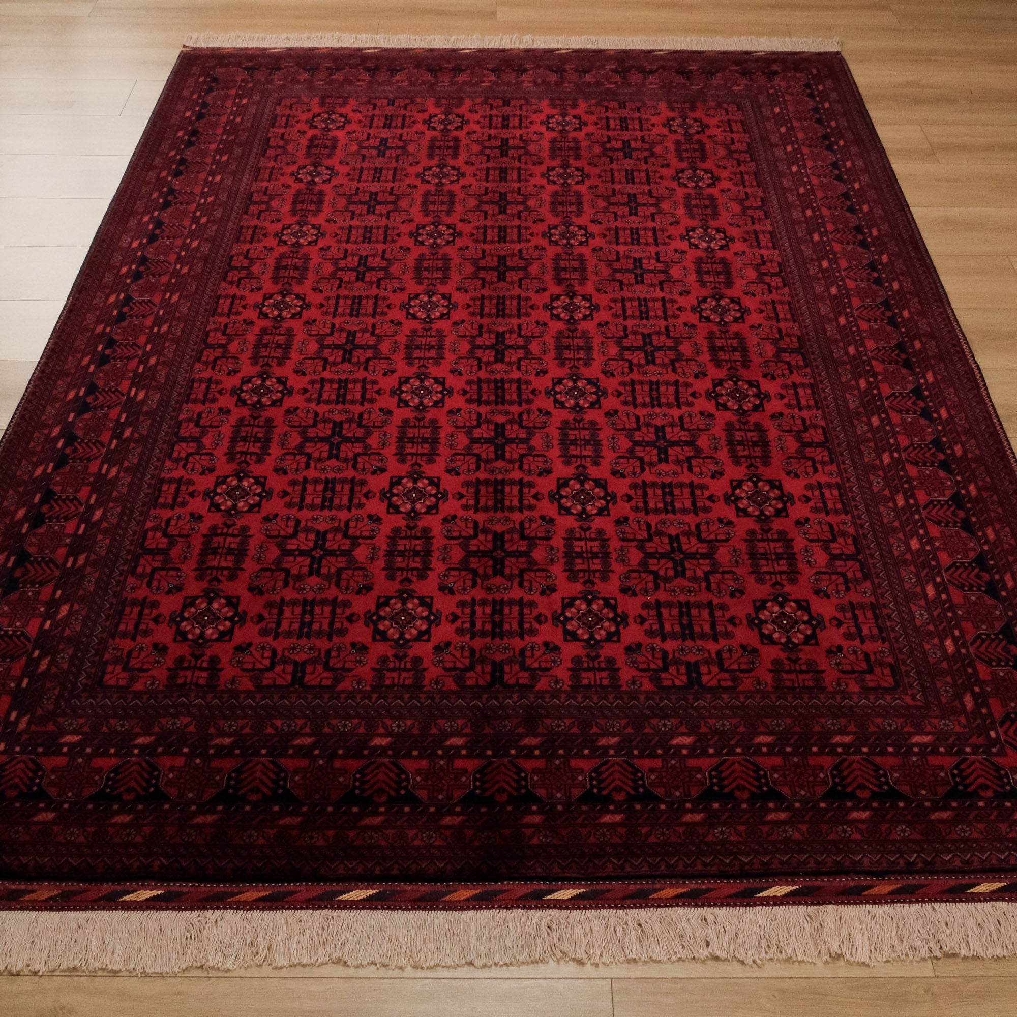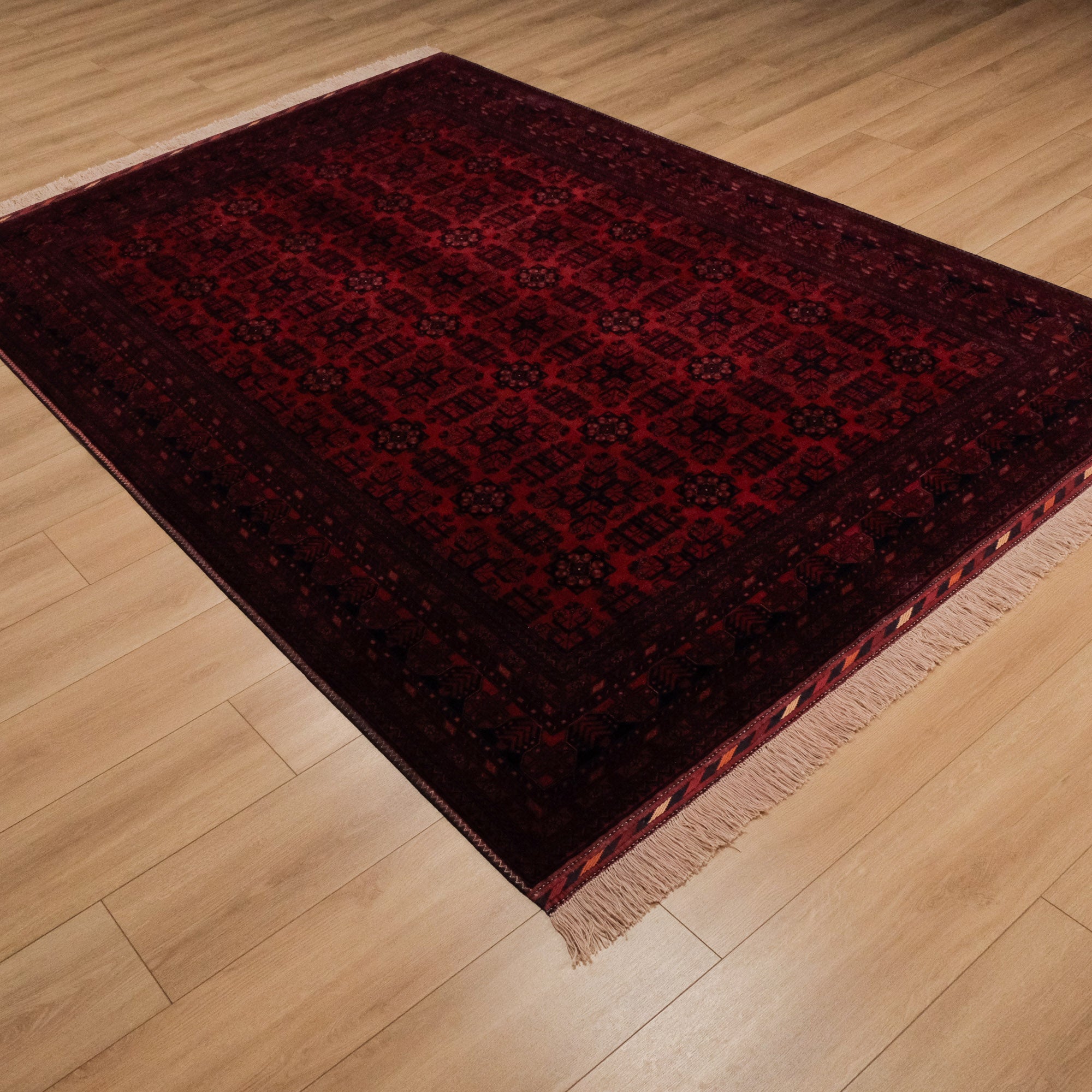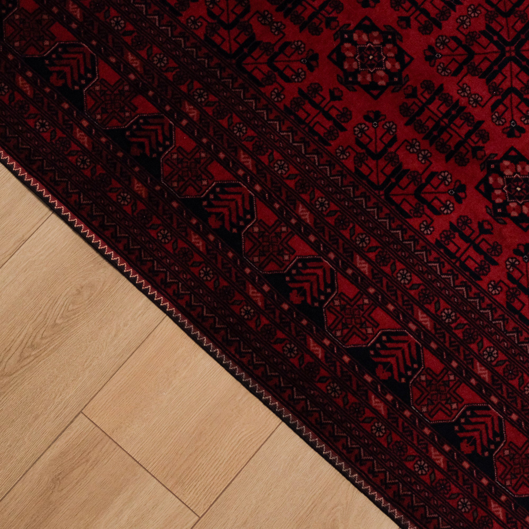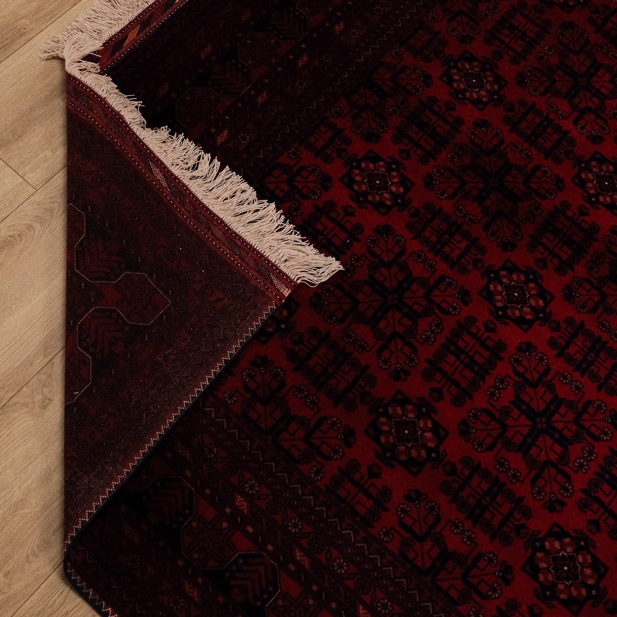 The Afghan Pattern Hand-Knotted Burgundy Wool Bilicik Rug brings centuries-old craftsmanship into modern living spaces. Measuring 201 x 293 cm, this exquisite rug reflects the dedication and artistry passed down through generations of Turkmen weavers in Afghanistan. Each knot, placed patiently over months, creates high-definition patterns that highlight the rich interplay of burgundy and deep navy hues, embodying a legacy of cultural storytelling.