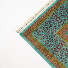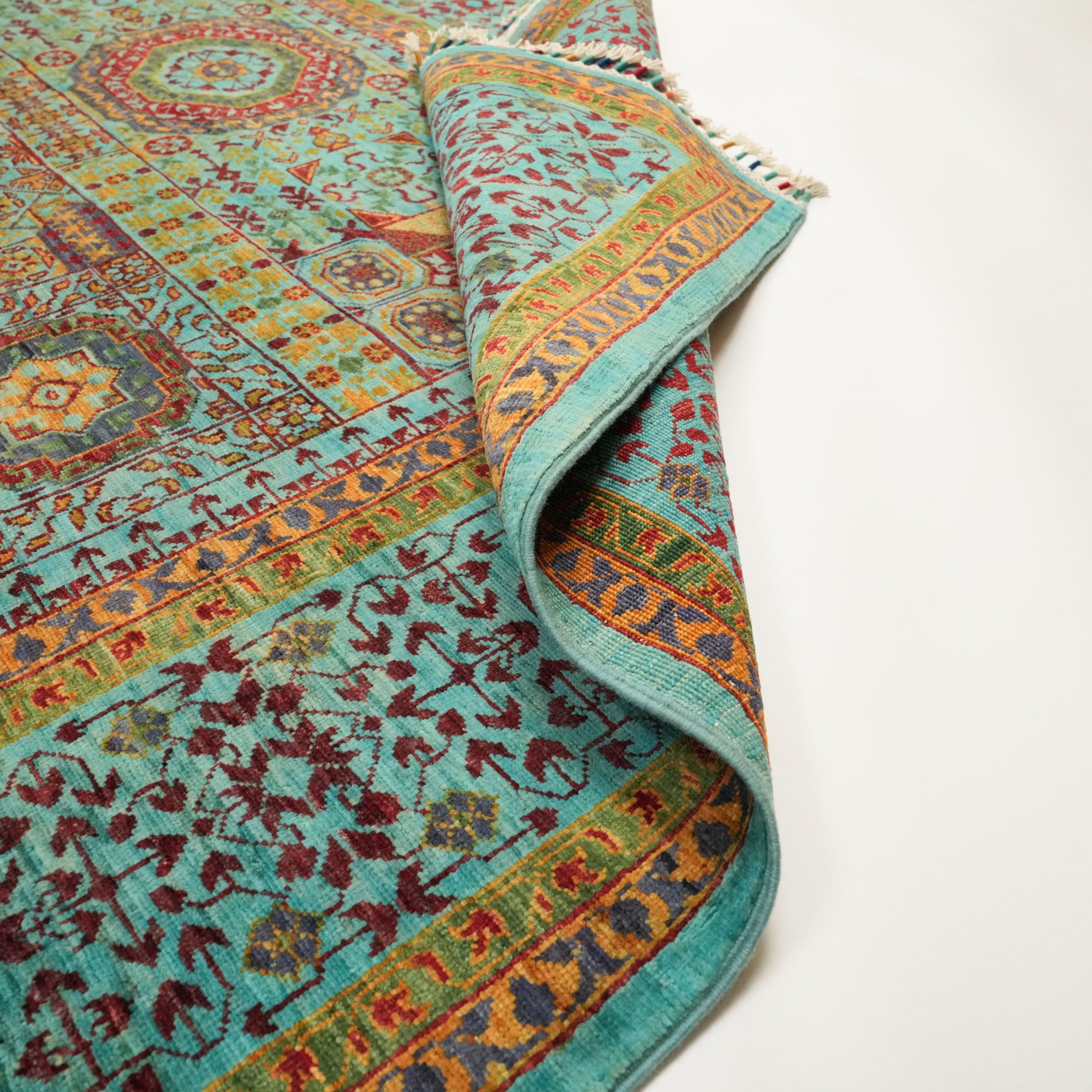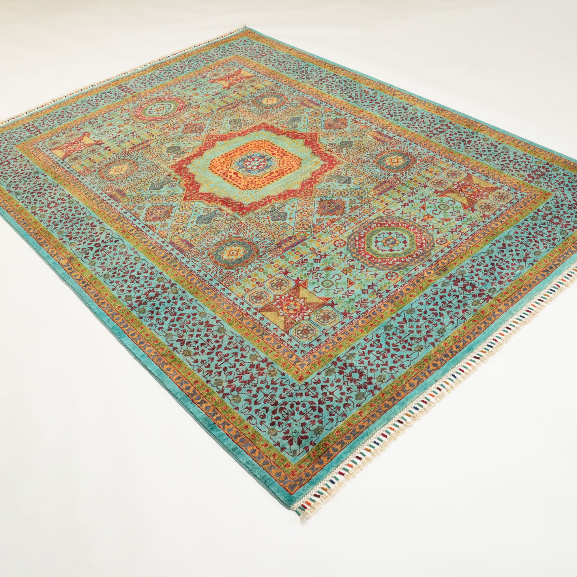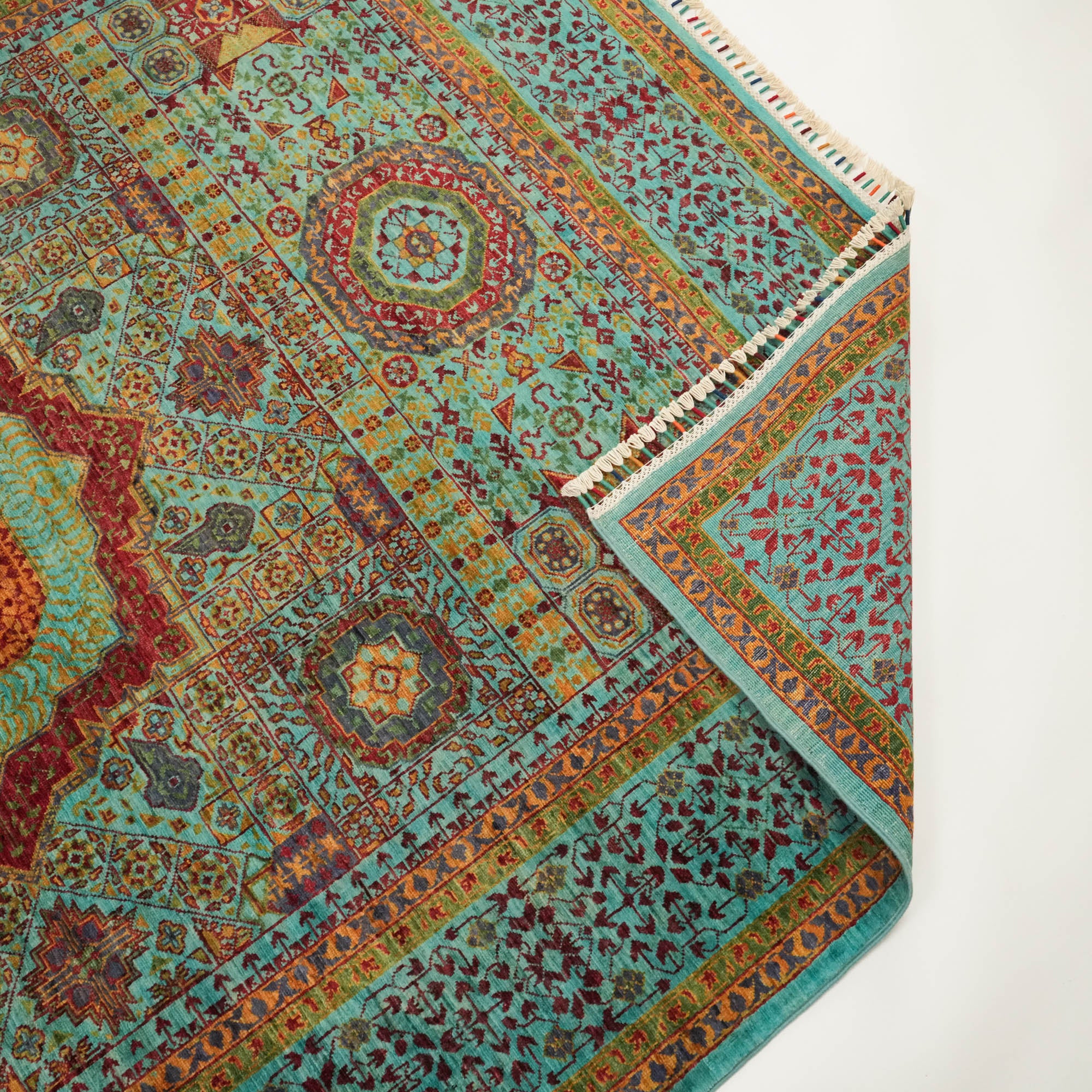 Each inch of the rug is densely packed with nearly 200 knots per square inch, allowing the intricate Mamluk motifs to appear with striking clarity. The surface is made entirely from natural wool, while the foundation consists of sturdy cotton and a trace amount of recycled synthetic fibers—enhancing both structure and sustainability.