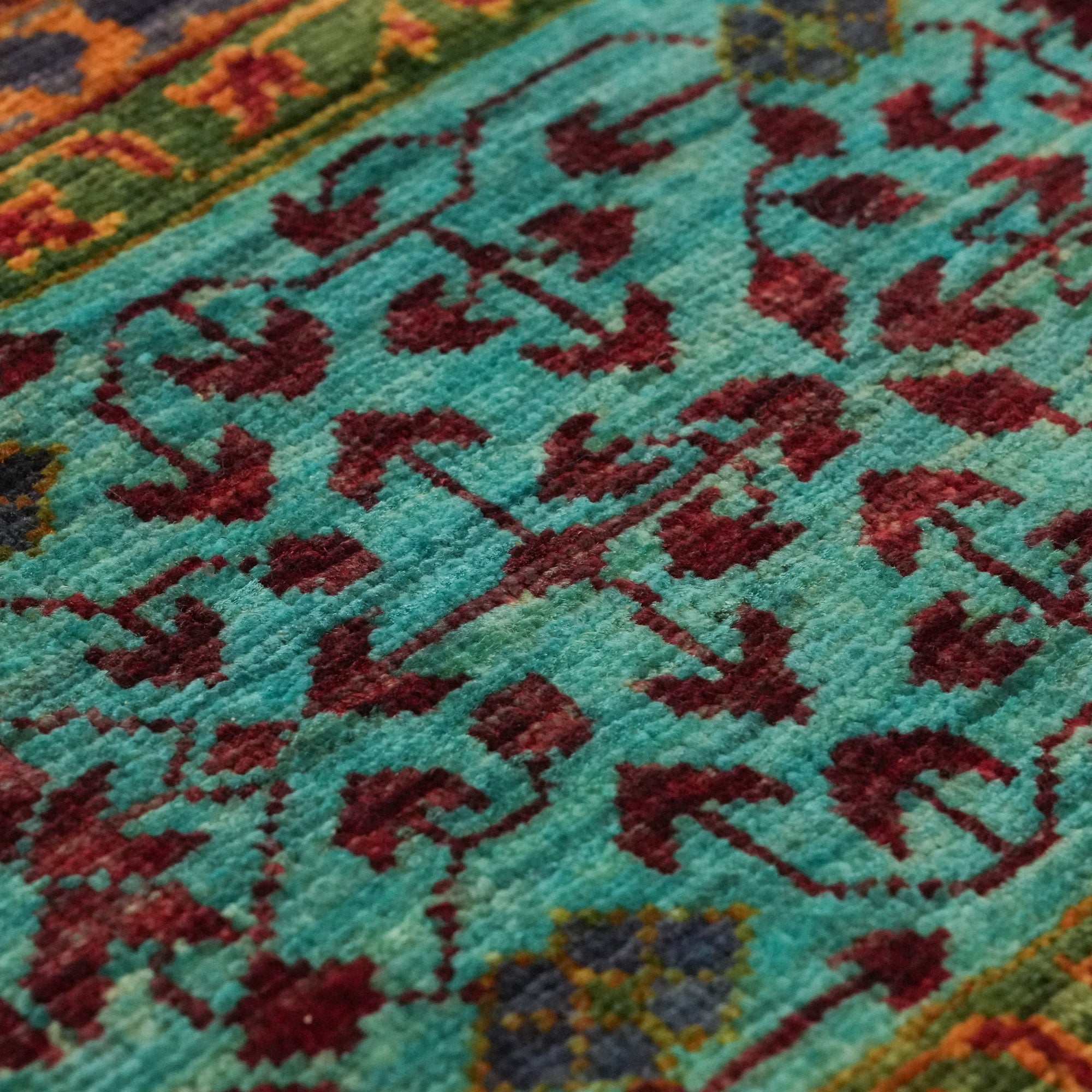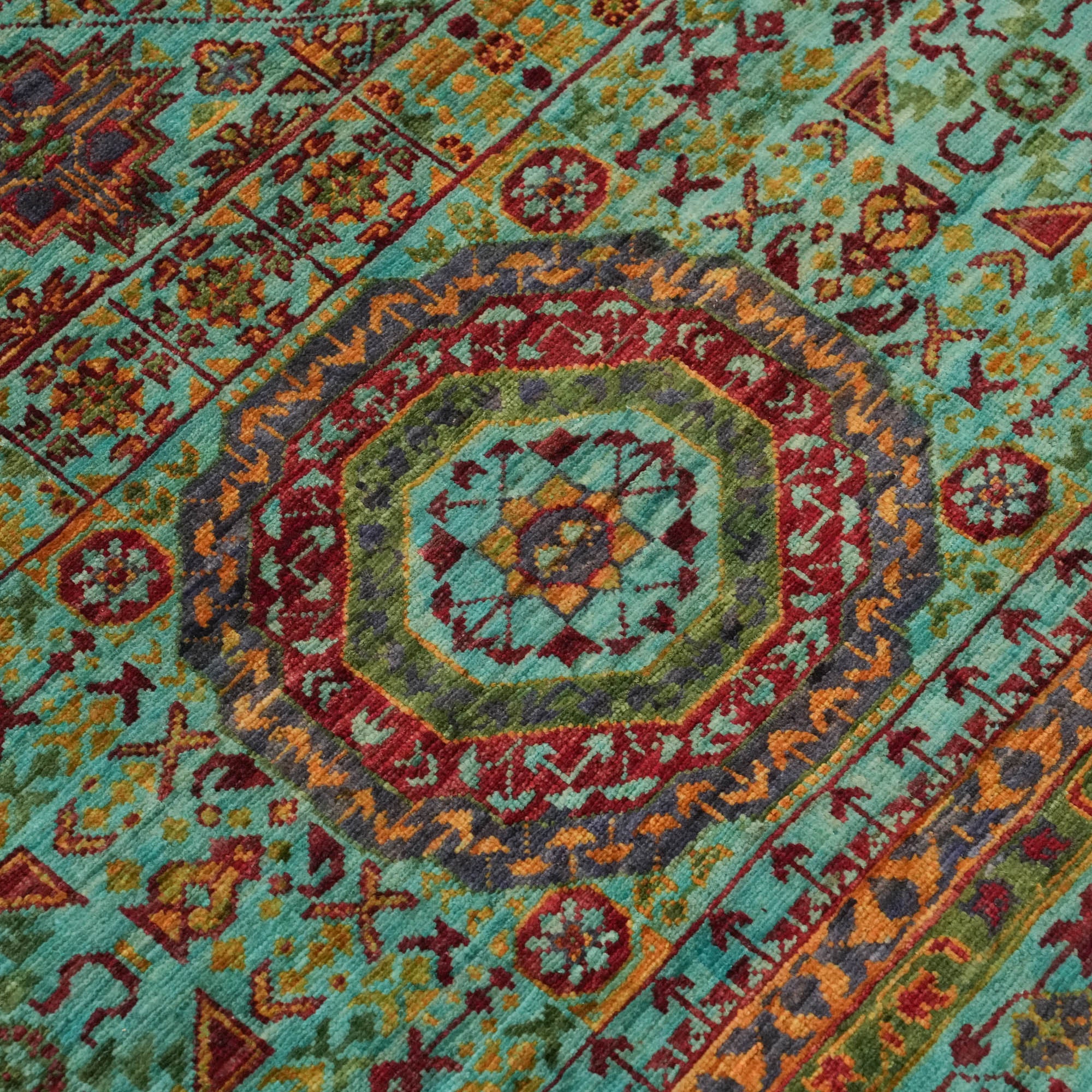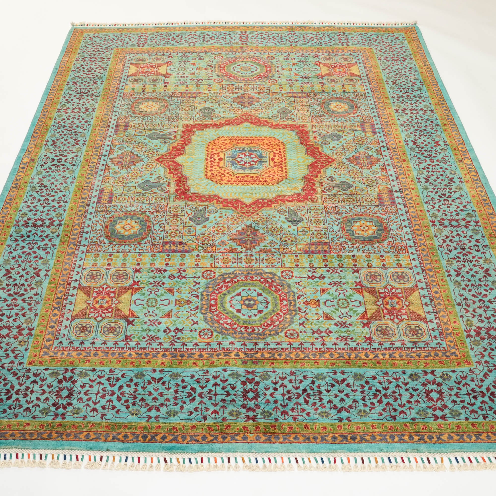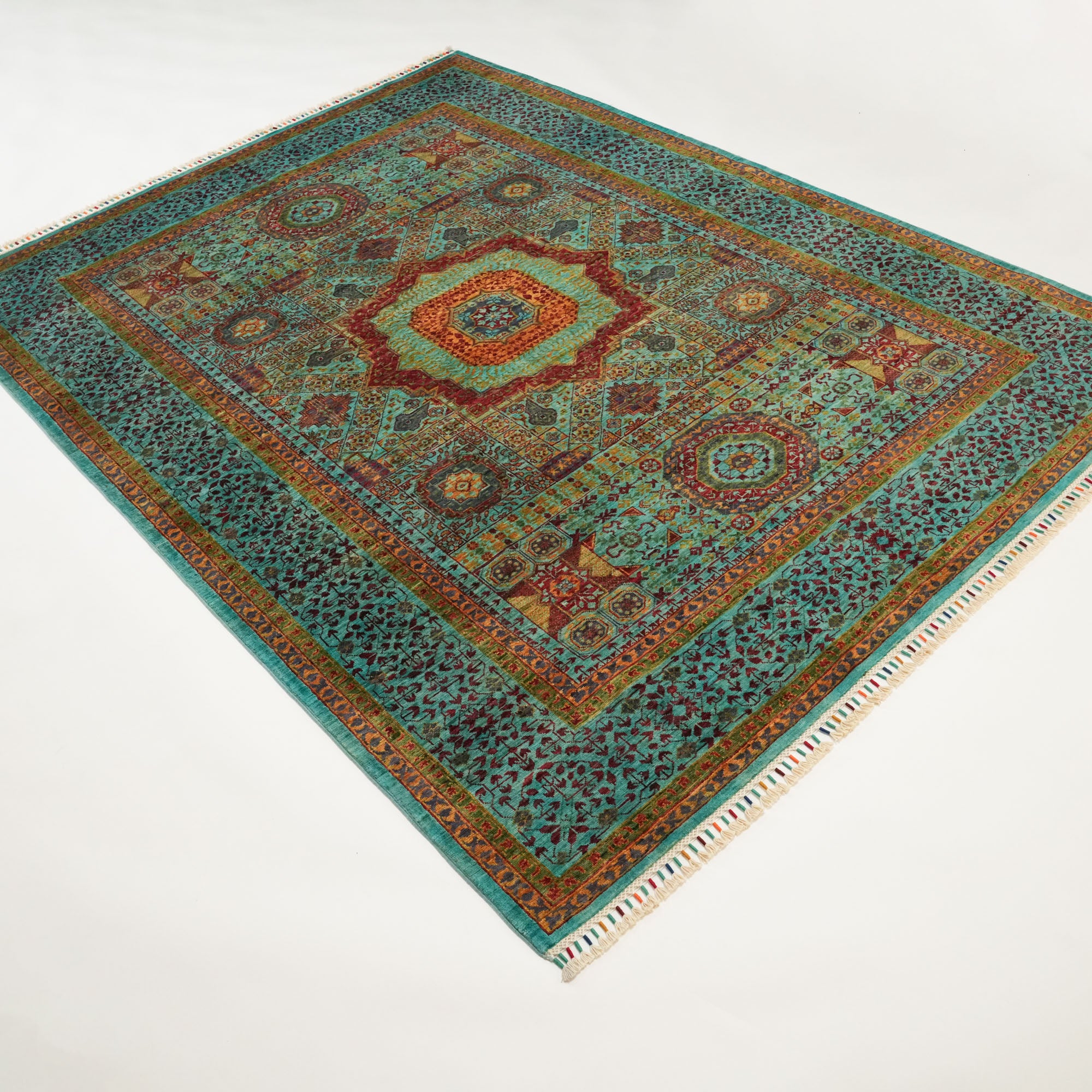 Each inch of the rug is densely packed with nearly 200 knots per square inch, allowing the intricate Mamluk motifs to appear with striking clarity. The surface is made entirely from natural wool, while the foundation consists of sturdy cotton and a trace amount of recycled synthetic fibers—enhancing both structure and sustainability.