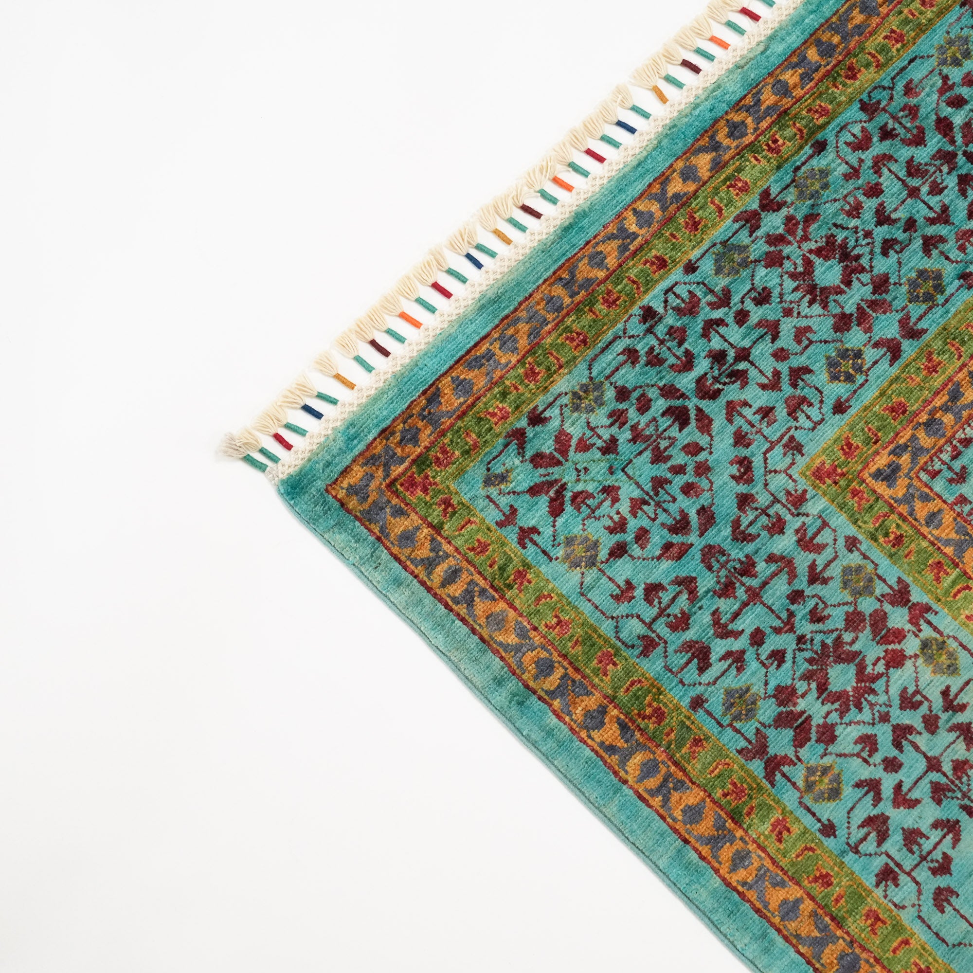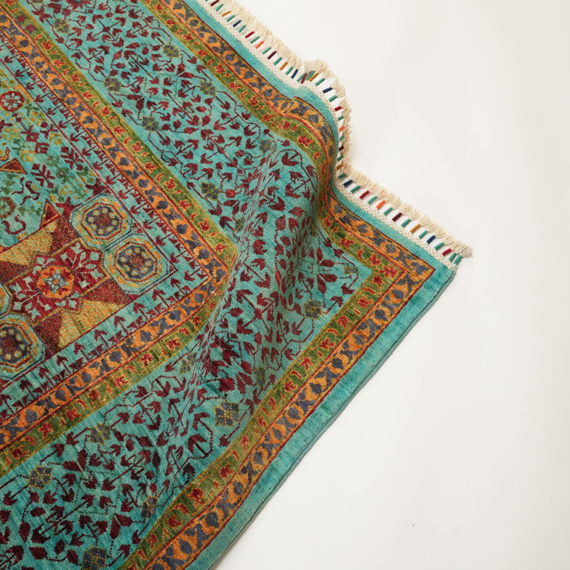 Handcrafted in Afghanistan and Pakistan by seasoned artisans, this handmade textile speaks of a centuries-old tradition of weaving excellence. The all-wool face feels soft yet substantial underfoot, offering both warmth and durability.